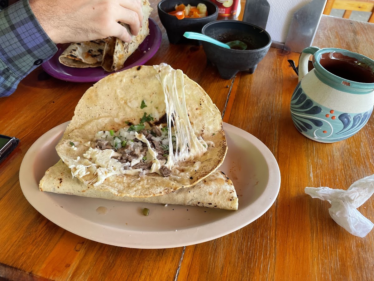 Este lugar lo descubrimos gracias a Maps y fue un éxito. A las afueras hay amplio espacio para estacionarse sin problema. La atención deja mucho que desear pero la comida está riquísima, las quesadillas están suficientemente rellenas y las gorditas (sopes) están bastante ricos también. El costo nos pareció bastante bien. Hay variedad de guisados y los que probamos estaban deliciosos. Pedimos un café de olla también y estuvo muy bueno. Recomendado